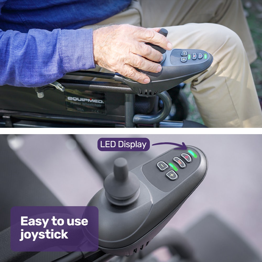 Getting on and off this Equipmed Power Wheelchair is easy thanks to swing-up armrests and the swing-up footrest. The retracting armrests also give you the option of dining at a table.