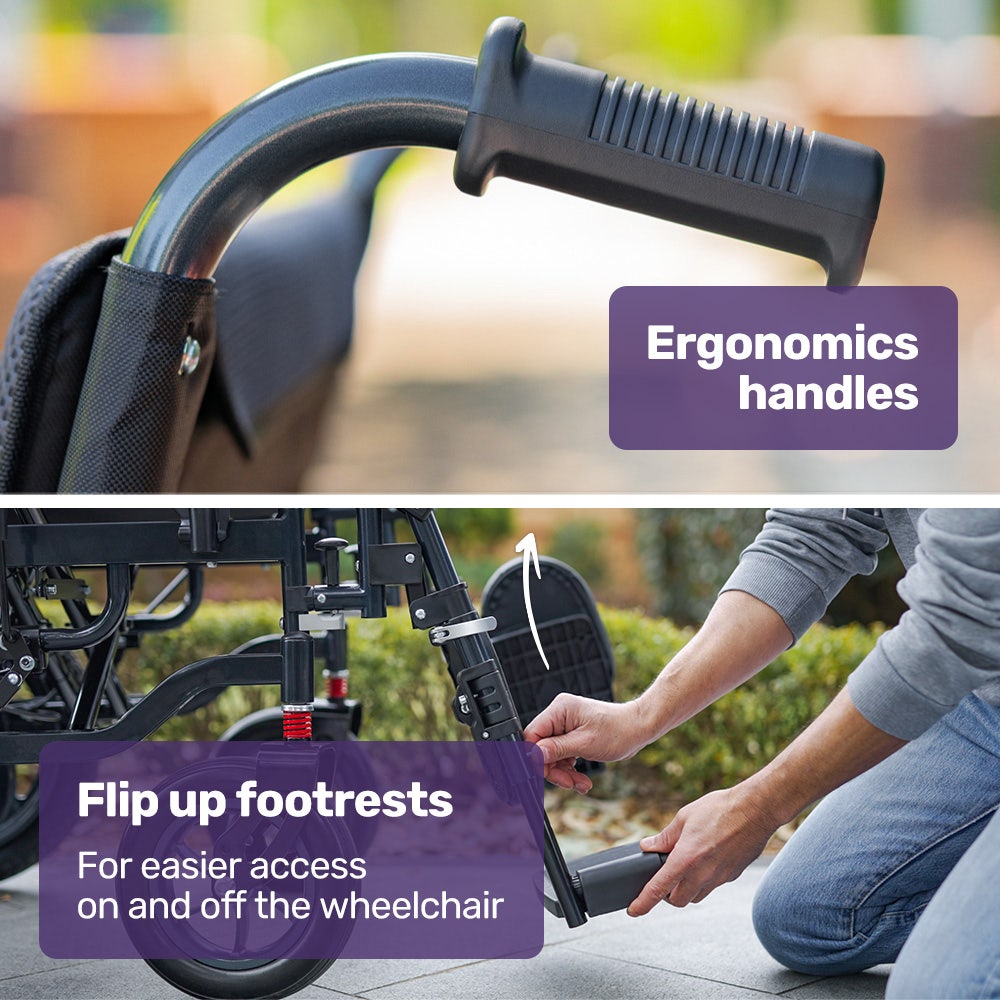 - Easy access and exit with flip-up armrests and fold-up foot rest