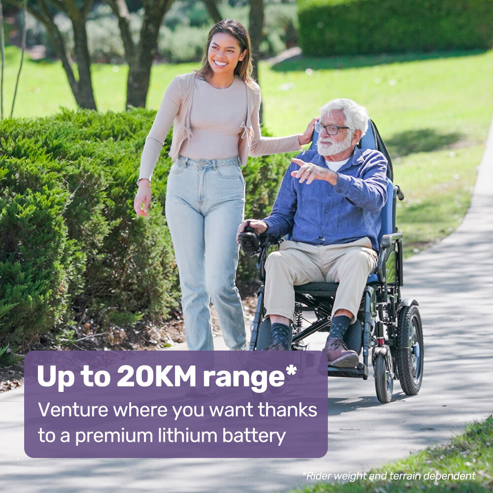 Riders of all shapes and sizes will appreciate the bariatric rated extra wide 52cm seat. Ride in pleasure thanks to the thick memory foam seat, backrest and headrest. The recline angle of the backrest is also adjustable to suit the rider's preference. A comfortable front and rear suspension system soaks up the bumps.